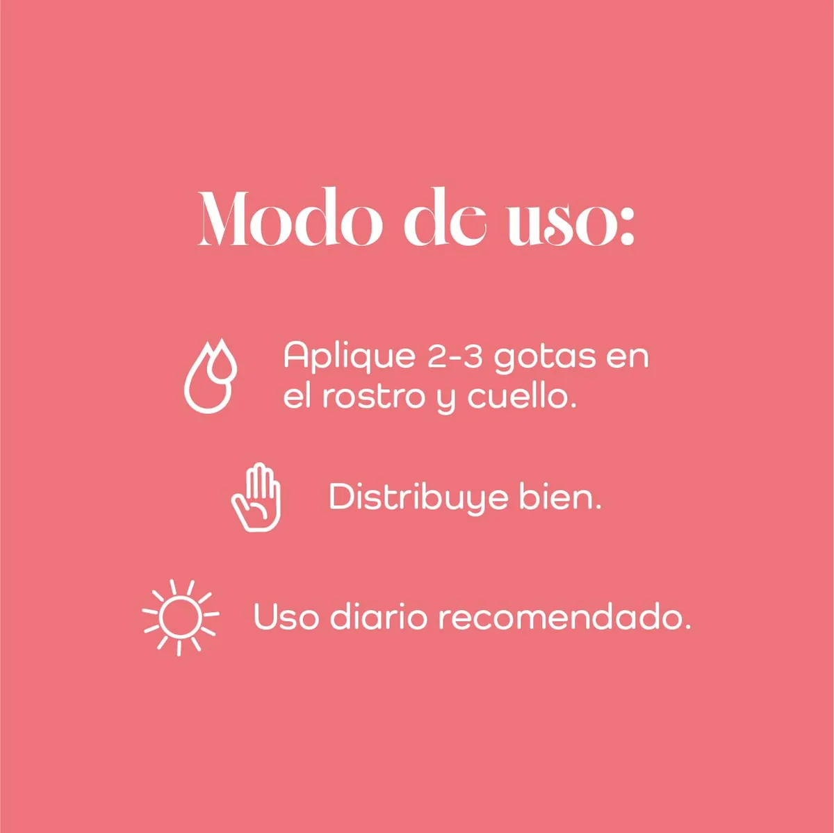 MODO DE USO: Aplica de 3 a 4 gotas sobre el rostro limpio y seco, tanto de día como de noche. Distribuye con suaves masajes hasta su total absorción antes de tu crema hidratante.