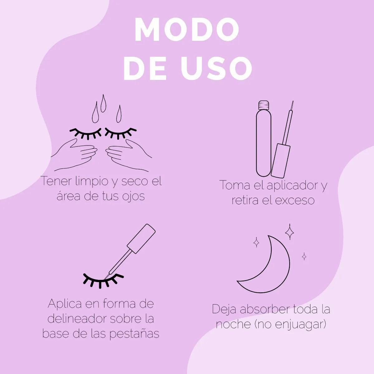 – Pestañas: Aplicar en forma de delineador sobre la base de las pestañas, asegurando que toque la piel. Dejar actuar durante la noche.